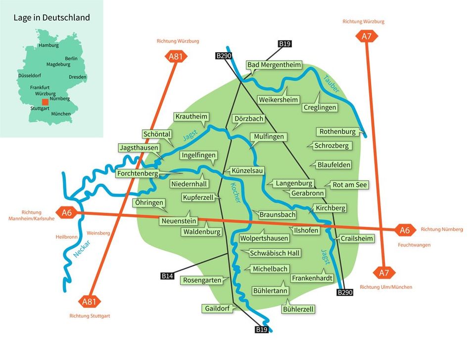Krautheim liegt im mittleren Jagsttal, das landschaftlich zu den schönsten und reizvollsten Gebieten Hohenlohes zählt. Hohenlohe, auch bekannt als Land der Burgen und Schlösser bietet vielzählige Möglichkeiten der Freizeitgestaltung für Ruhe- und Erholungssuchende. Im Umkreis von ca. 25 km steht Ihnen ein abwechslungsreiches Kultur- und Freizeitangebot zur Verfügung.